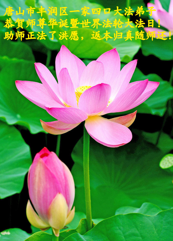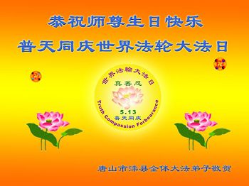 唐山一家學法小組代表開平及唐山大法弟子恭賀師尊六十三歲華誕!慶祝第十五屆世界法輪大法日!叩謝師尊慈悲救度之恩,遙祝師尊生日快樂!