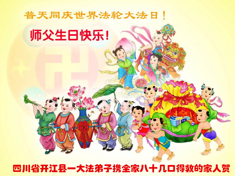 四川南充一夫妻大法弟子及家人感謝師尊救度之恩,恭祝師尊華誕快樂!恭賀法輪大法在世洪傳二十二週年!