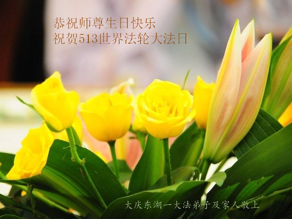 在這大慶大喜的日子裏,我們全小組的同修向師尊祝以崇敬的拜候!祝師尊生日快樂!回顧師尊傳法二十二年來,風風雨雨、坎坎坷坷,為了弟子、為了眾生付出了一切,在此弟子心裏真的很難受,我們是無法用盡人類的語言表達對師父的感恩,只有在修煉的路上更加精進,聽師父的話,做好三件事,救度更多的眾生,請師尊放心,我們會做到的。