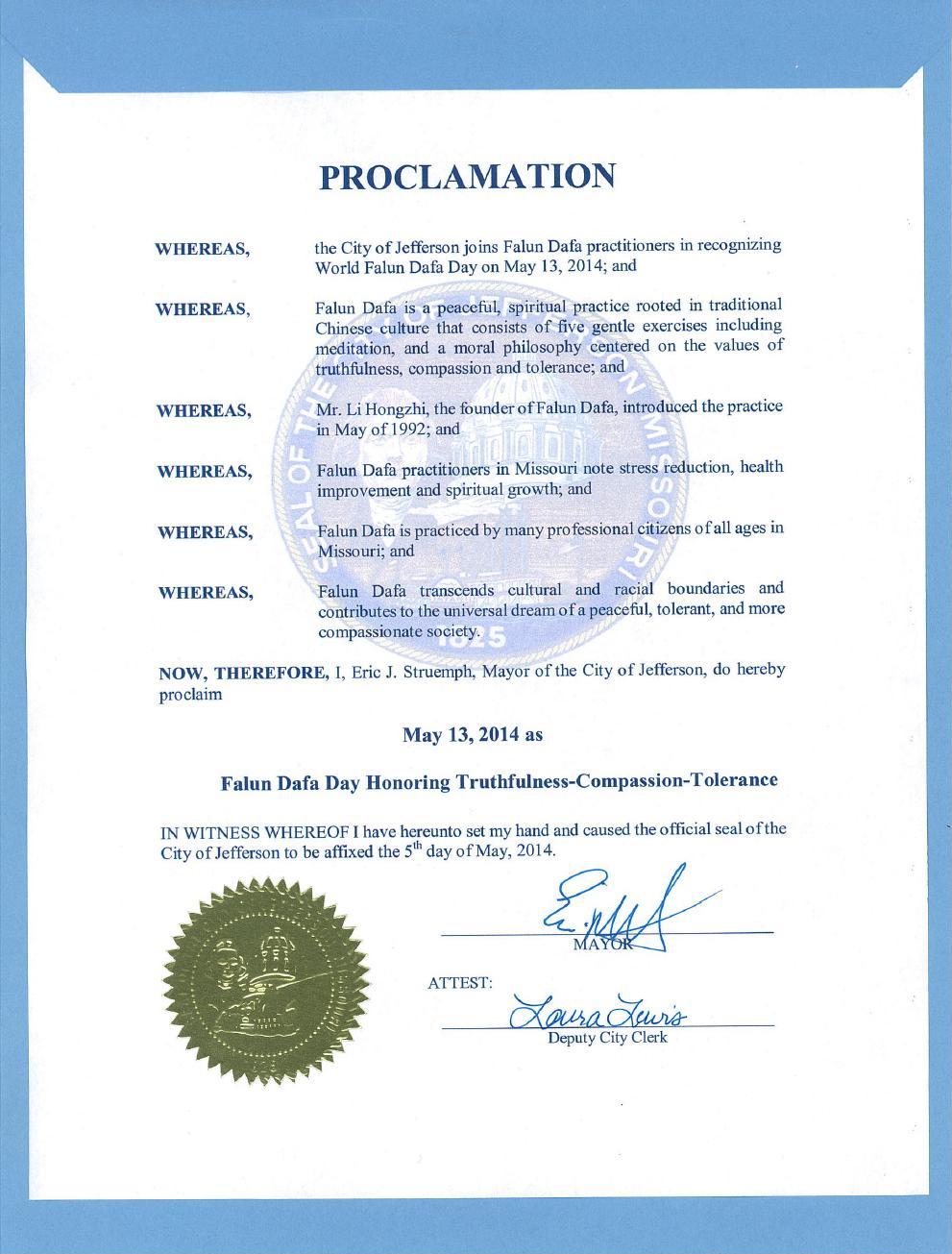 鑑此,我,傑斐遜城(Jefferson City)市長Eric J. Struemph,特此宣告二零一四年五月十三日為