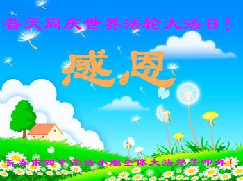在世界法輪大法日來臨之際,弟子在此向慈悲偉大的師父問候!師父您好!您辛苦了!在二零一四年師父給大法弟子和眾生開創的佛恩浩蕩的今天,在師父給弟子加持的正念之中,我們會和全世界大法弟子一道清除一切敗物和阻礙我們正念的黨文化流毒,在大法中歸正一切不正確狀態,多學法,多去執著心,多救人,兌現史前誓約。