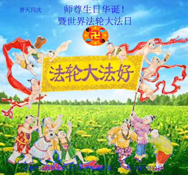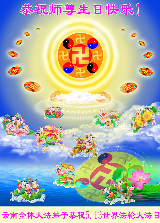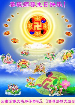 雲南全體大法弟子恭祝慈悲偉大的師尊生日快樂!慶祝世界法輪大法日暨大法洪傳二十二週年!