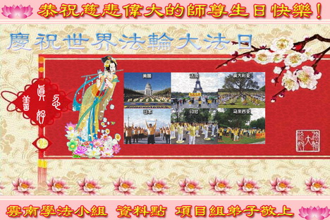 雲南各學法小組、資料點、項目組大法弟子恭祝慈悲偉大的師尊生日快樂!普天同慶世界法輪大法日暨大法洪傳二十二週年!