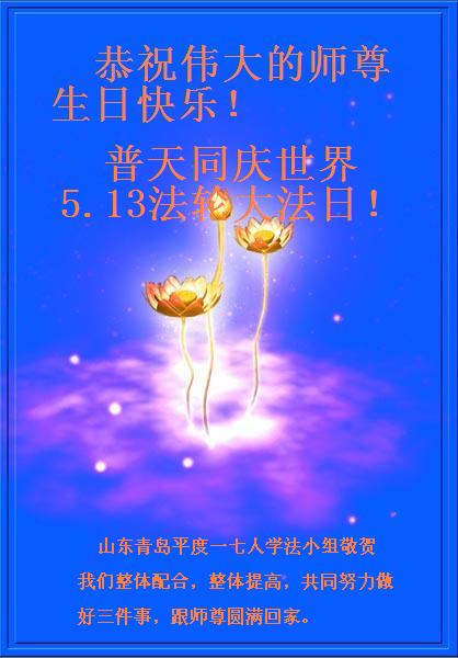 山東青島開發區大法弟子恭祝師父生日快樂,恭賀世界法輪大法日!