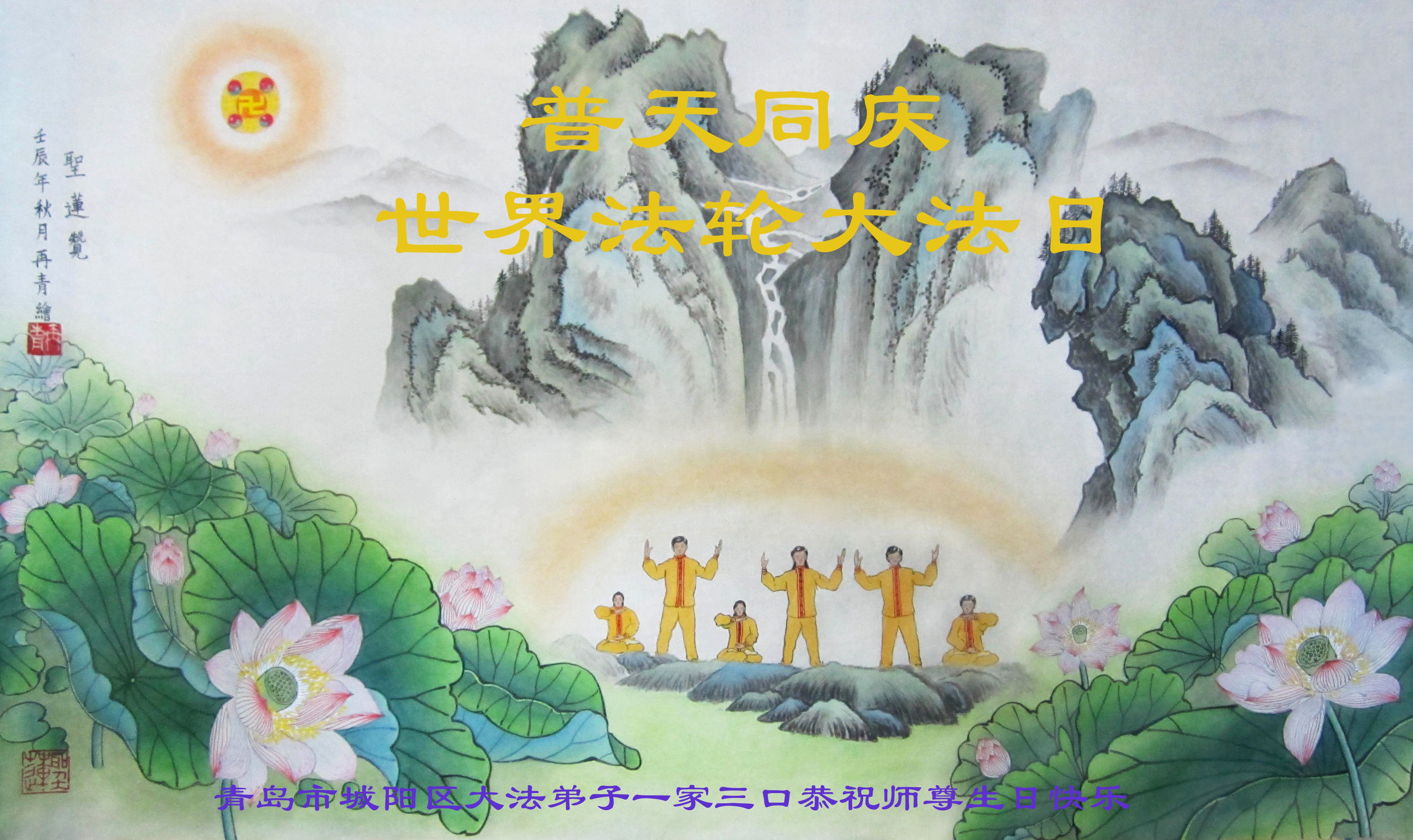 山東青島一家大法弟子恭祝師尊生日快樂!恭賀世界法輪大法日!