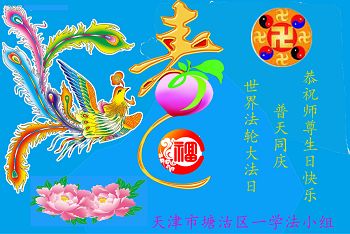 天津大法弟子全家恭祝慈悲偉大的師尊生日快樂!祝賀法輪大法洪傳二十二週年!