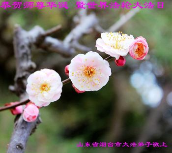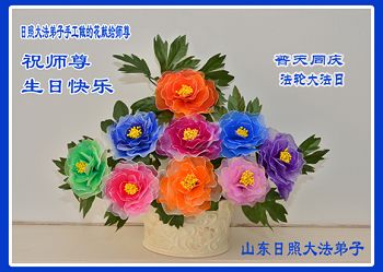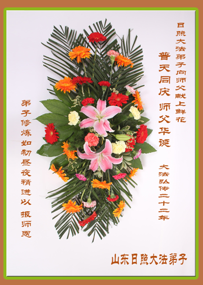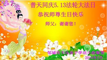 我是山東省─老年大法弟子,僅代表弟弟妹妹五個家庭三十四人,向偉大的師尊致敬,遙祝恩師六十三歲生日快樂,我們一定牢記恩師教導,認真做三件大事,在修煉路上精進再精進!