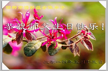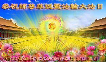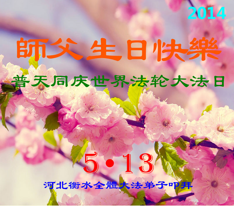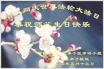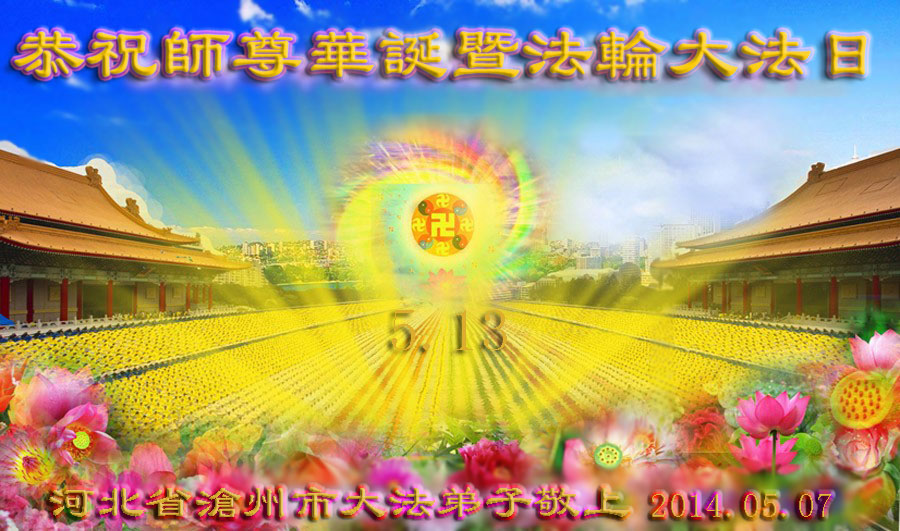 河北省唐山市開平區、豐潤區、豐南區、路南區、路北區多名大法弟子和流離失所的大法弟子,恭祝師父六十三華誕!同賀五•一三「世界法輪大法日」暨大法洪傳二十二週年!並代很多明真相的世人向師父表達誠摯的謝意,給師父拜壽,祝慈悲偉大的師父生日快樂!