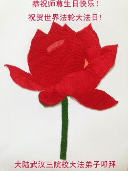 每當我捧起《轉法輪》書時,就看一看書後面《蓮花》我想起時間不多了,聖花開了,師父給大法弟子敲警鐘了。要精進啊!要抓緊時間,多學法、學好法、多救度眾生。是啊!能當上師父弟子多麼榮耀啊!天天能看到神聖蓮花,感恩師父慈悲救度。唯有精進、精進、再精進,多救眾生,來報答師父。兌現當初與師父立下的誓言,決不辜負助師正法救度眾生的歷史使命!弟子一點心意,用手親自刺繡《蓮花》恭祝師尊生日快樂!祝賀;世界法輪大法日!