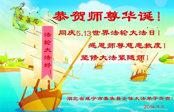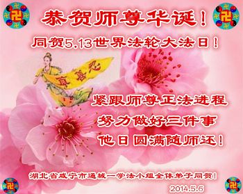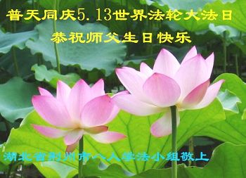 我是99年得法的老弟子,得法時還在讀湖北中醫學院,在慈悲偉大的師尊呵護下,走過了十五年,也有因自己心不正走過彎路,也有正念足時,師尊的加持,一步步走了過來。自己深知得法不易,要努力精進,做好三件事,隨師圓滿還。值此佳期,普天同慶世界法輪大法日暨恭賀師尊華誕!合十。