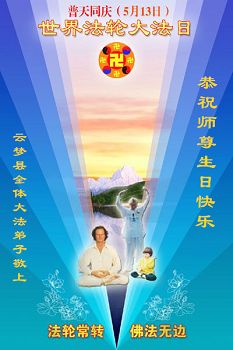 我是跟過師父班的老弟子。師父,弟子想念您,感謝師父的救度之恩。在普天同慶之日,我向慈悲偉大的師父問好,恭祝師父華誕!恭賀世界法輪大法日!