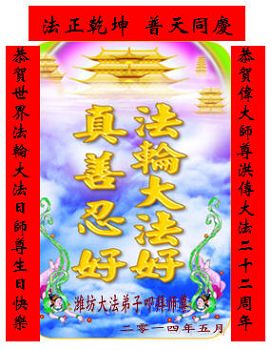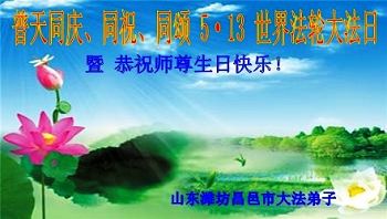 感謝師尊的慈悲救度!山東濰坊青州大法弟子恭祝師尊生日快樂!恭賀大法洪傳二十二週年!普天同慶5.13世界法輪大法日!