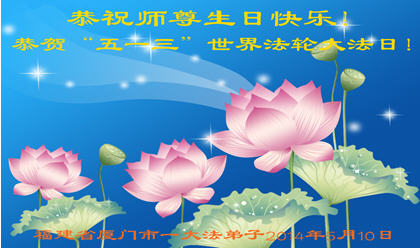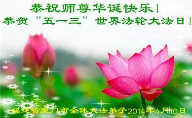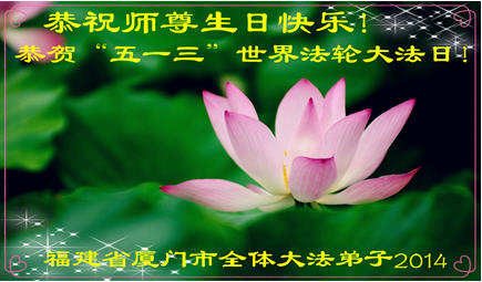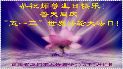 在5.13世界法輪大法日到來之際,我們廈門全體大法弟子,以崇高的敬意向慈悲偉大的師父表示衷心的問候:師父好!師父您辛苦了!請師父放心,在正法最後的時刻,弟子們一定會學好法,紮紮實實的修好自己,遇事向內找,講清真相,救更多的人,兌現史前誓約,跟師父回家。