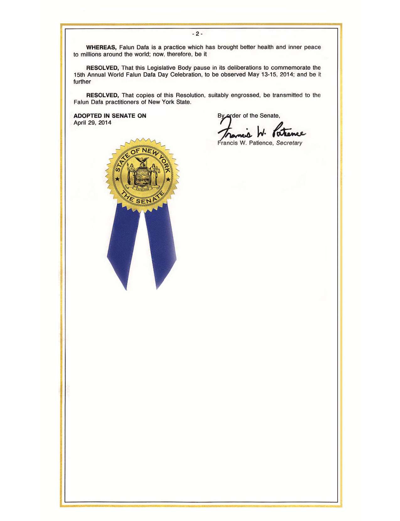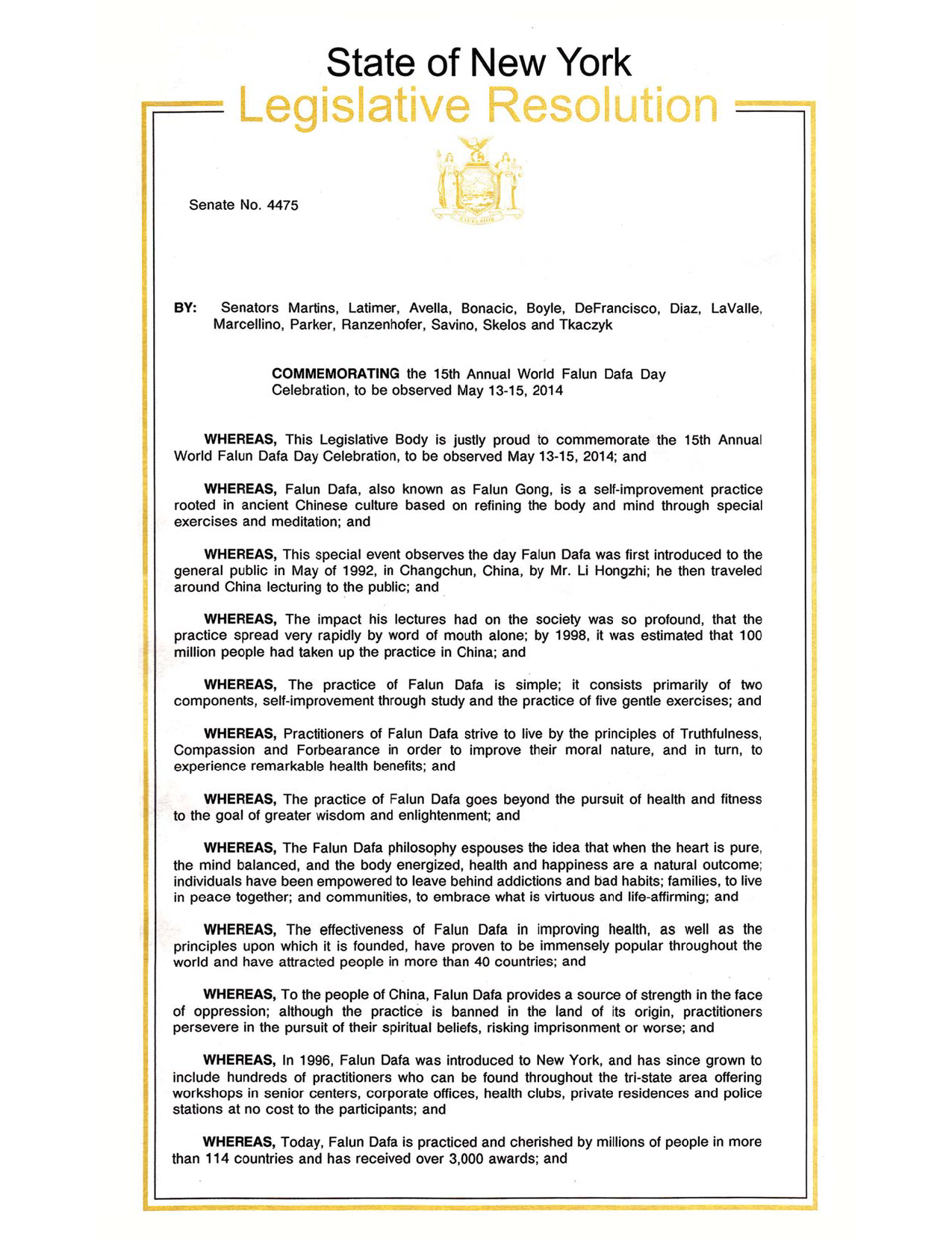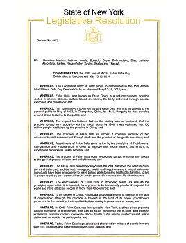 因此,紐約州參議院通過慎重考慮,通過決議紀念「二零一四年五月十三日至十五日,第十五屆世界法輪大法日的慶祝」,