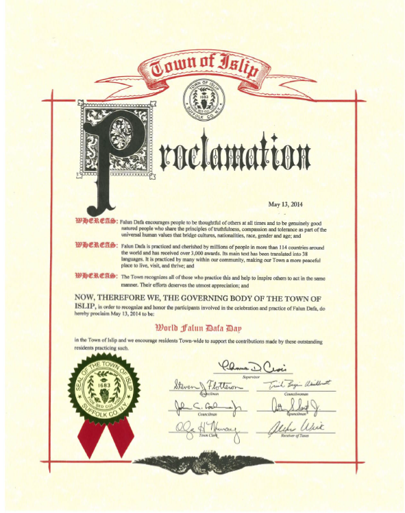 因此,艾斯利普鎮的行政機關嘉獎慶祝法輪大法日的修煉者們,宣布