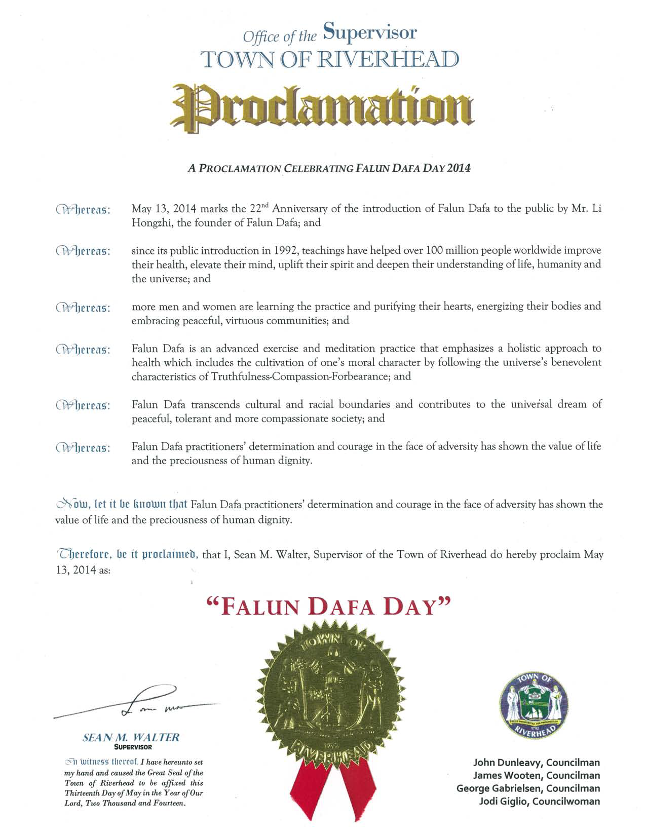因此,河源鎮鎮長褒獎二零一四年五月十三日是「法輪大法日」。