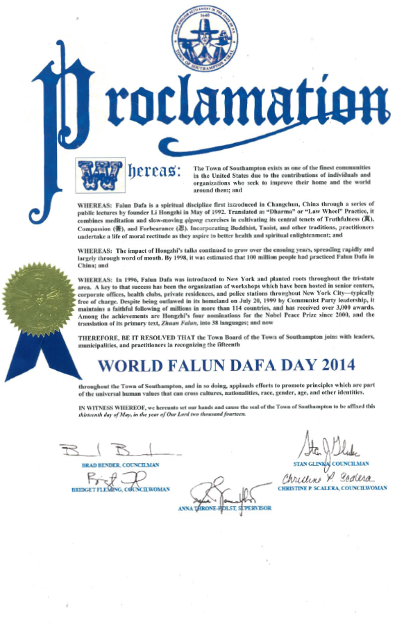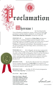 鑑此,南安普頓鎮褒獎「二零一四年世界法輪大法日」。