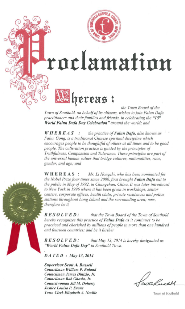 鑑於,南區小鎮的鎮長和市議員宣布,希望他們的市民加入法輪大法修煉者以及他們的家人朋友對「第十五屆世界法輪大法日」 全球慶祝中;並且