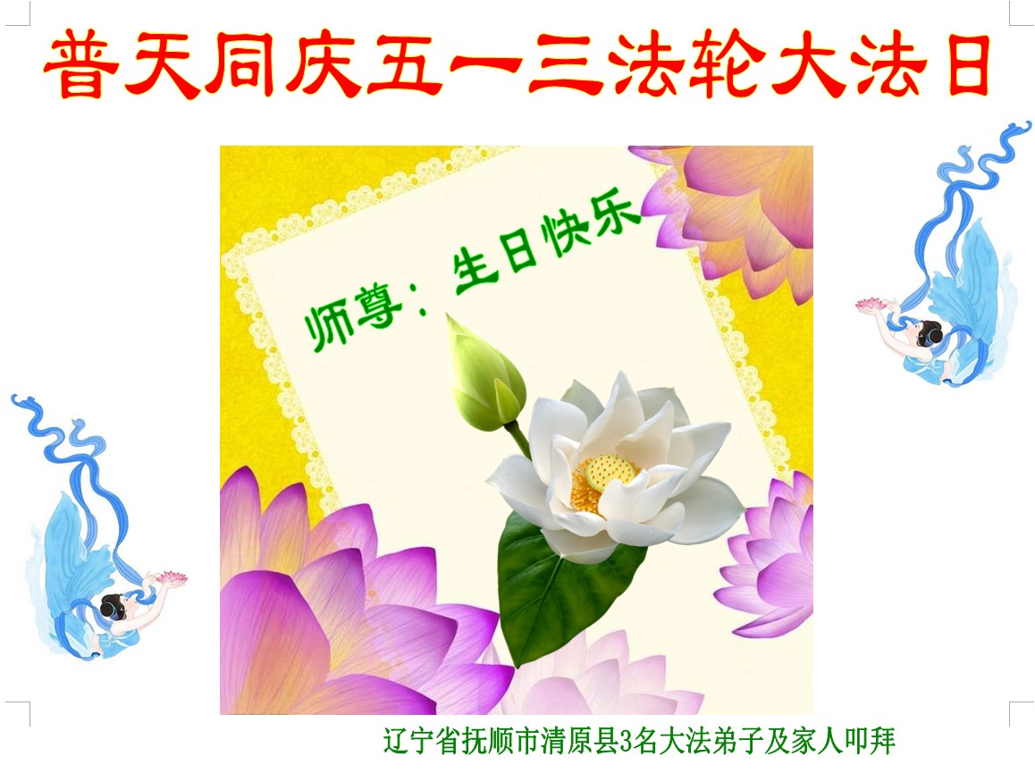 遼寧省撫順一全家大法弟子恭祝慈悲偉大的李洪志師父63歲華誕!