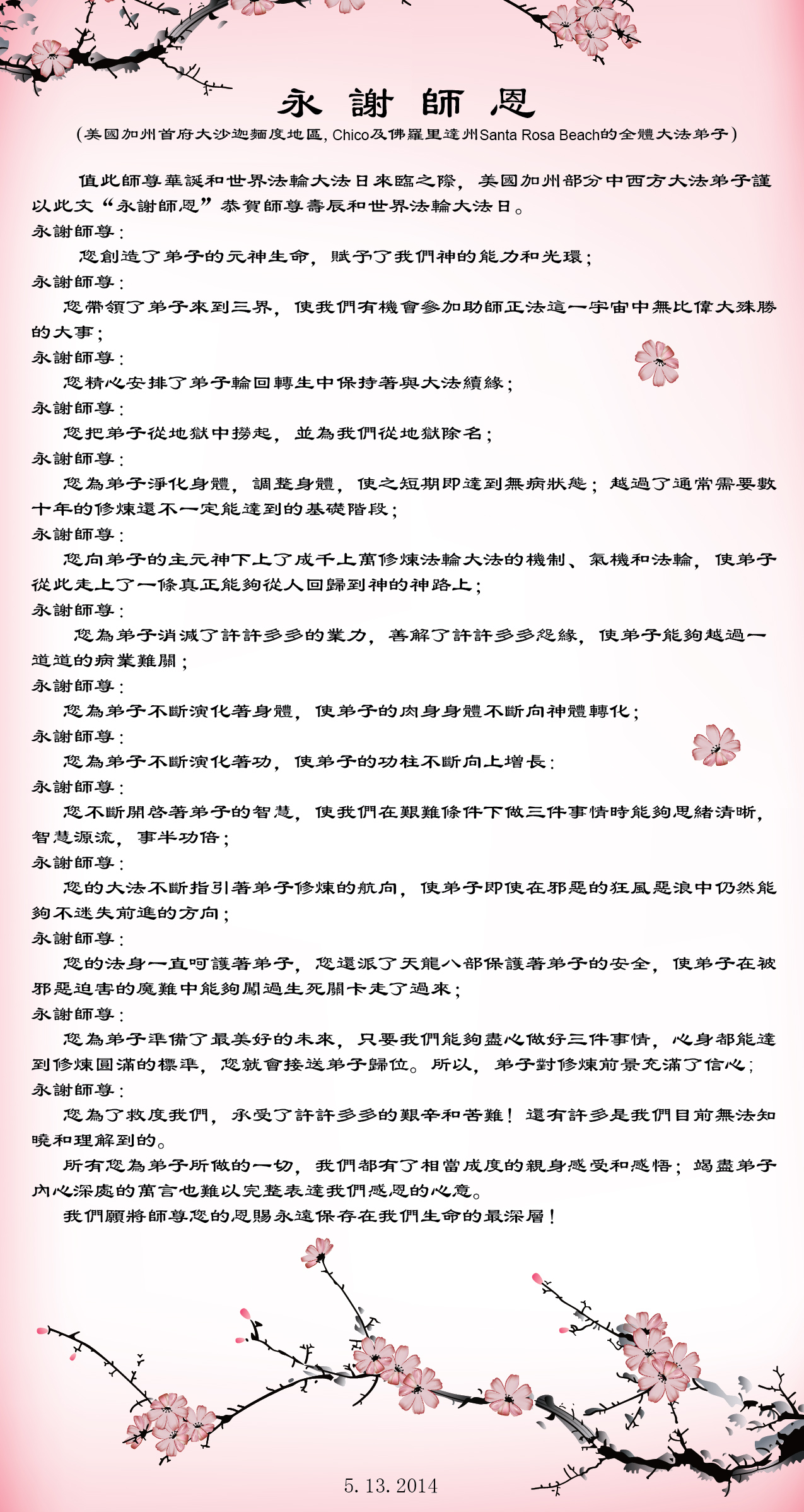 全體北加州大法弟子由衷感恩師尊的慈悲救度!同時,我們為自己能成為「正法時期大法弟子」,能「助師正法」而感到無比榮耀。