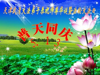 天津武清大法弟子恭祝師尊華誕快樂!我們與全世界大法弟子同祝法輪大法日師尊傳法普度22週年!