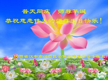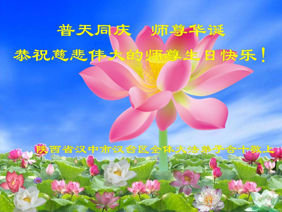 在這普天同慶的日子裏,我們陝西省漢中市漢台區全體大法弟子合十敬上,恭祝慈悲偉大的師尊生日快樂!我們一定會珍惜這萬古機緣,牢記師尊的教誨和正法時期大法弟子的使命,正念正行更精進,廣傳真相救眾生才能不負師尊厚望!