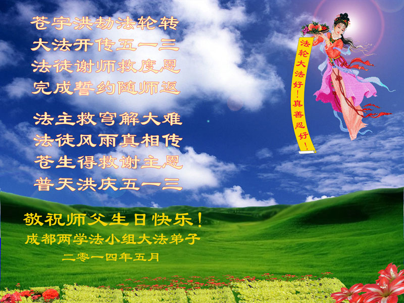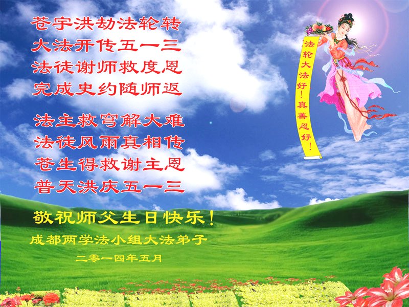 在這普天同慶「5.13」世界法輪大法日的喜慶日子裏,我們學法小組恭祝師尊生日快樂!