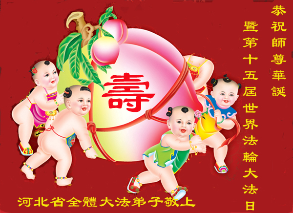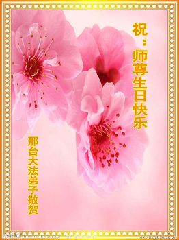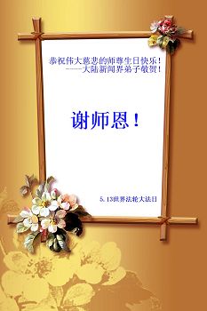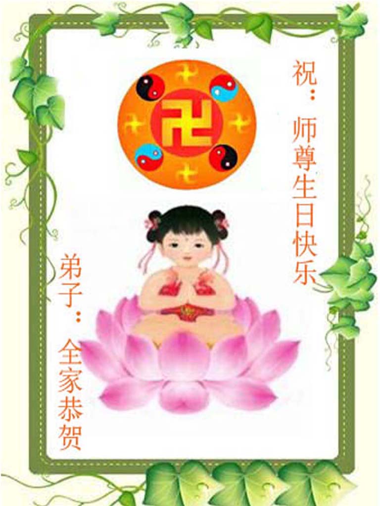 師尊您好,祝您生日快樂!我是一名九歲的小弟子,記得我小的時候,有一次我的牙齒被很硬的東西摔斷了,婆婆看見了,趕忙叫我誠念「法輪大法好,真善忍好!」我念了幾次後,一會就不流血了。師尊,在此,我和弟弟代表我們一家人向你說聲:「師尊,您辛苦了,生日快樂,我們一定要做一個乖孩子。」