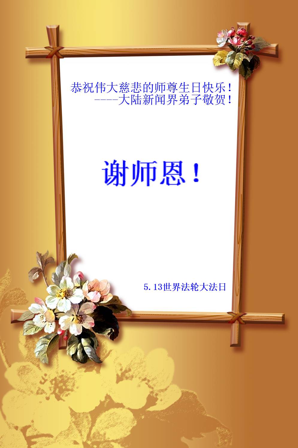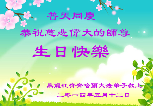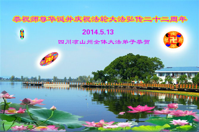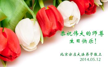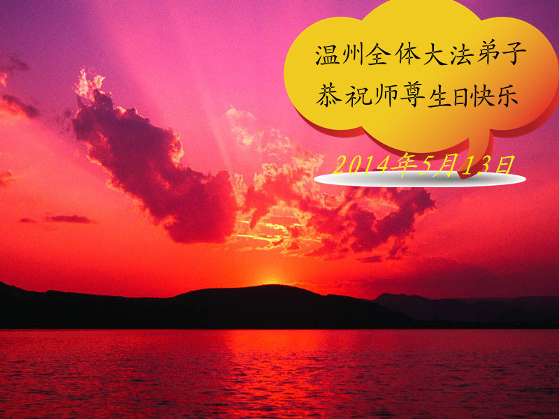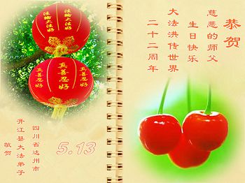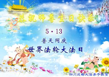 五月十三日在這個普天同慶的日子裏,福州母女大法弟子恭祝恩師生日快樂!慶賀法輪大法洪傳世界二十二週年!弟子一定走好剩下的路!精進實修,不辜負恩師的救度之恩。
