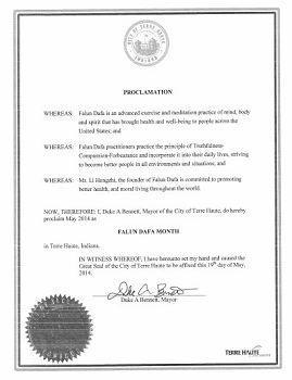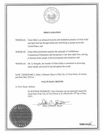 鑑此,我,印第安納州特雷霍特市(Terre Haute,Indiana)市長杜克•阿•貝乃特(Duke A Bennett),特此宣告二零一四年五月為「法輪大法月」。