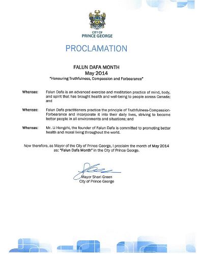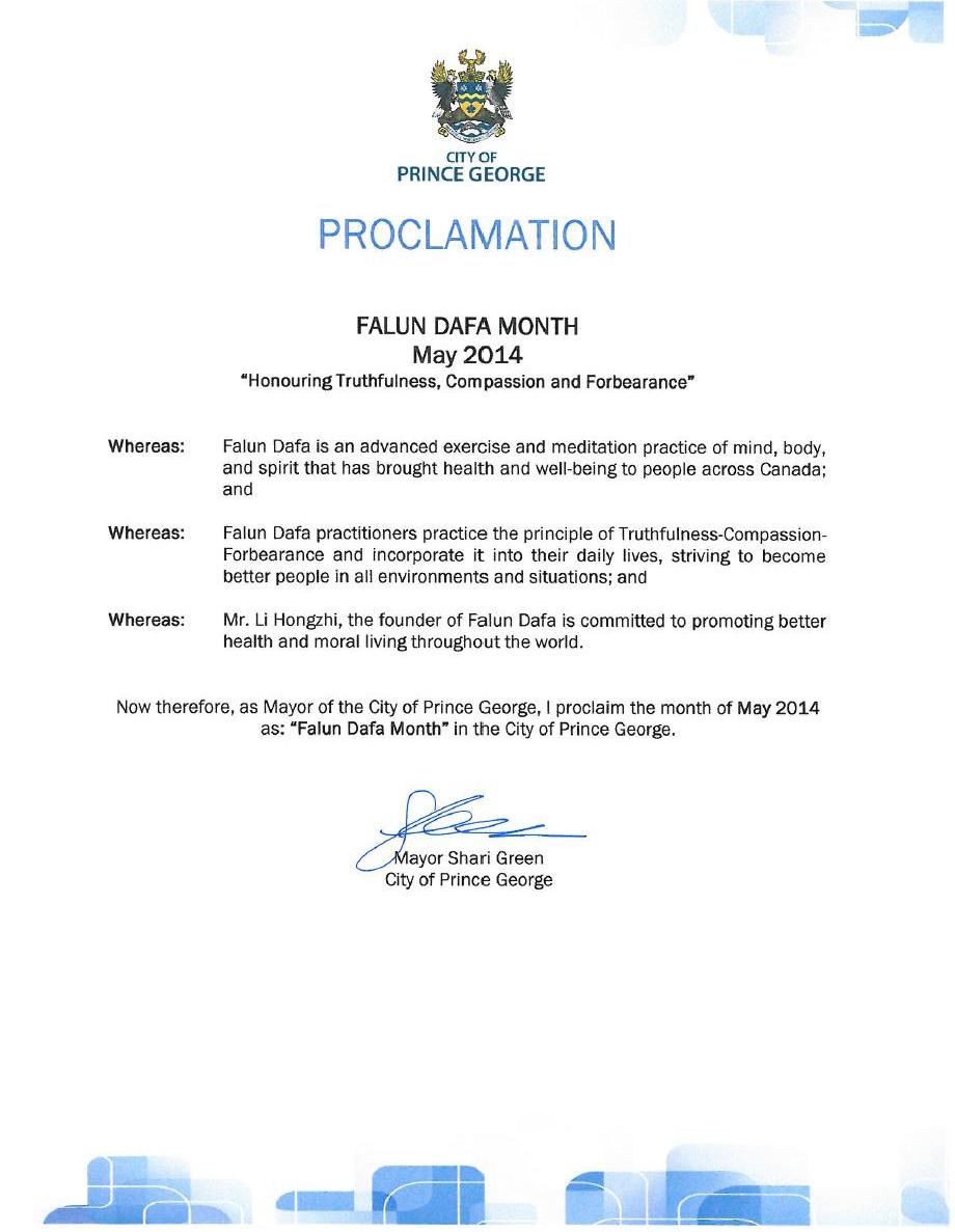 鑑此,作為喬治王子市長,我,莎麗•格林,特此宣告二零一四年五月為「法輪大法月-弘揚真善忍」。