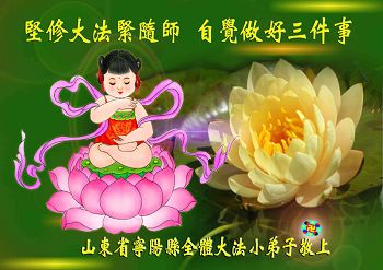 弟子按照師尊的要求,多學法,提高自己的心性,發現不符合真、善、忍大法的執著心即刻去掉。弟子雖小,但在師尊的慈悲呵護下,弟子向世人講清真相時,不論世人甚麼樣的態度,弟子都能非常理性的來面對,使好多好多的世人明白了真相,進入了美好的未來。弟子今後會更加精進,無條件的做好三件事,做一個合格的大法徒,跟師尊回家。