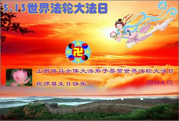 山西省臨汾市侯馬市全體大法弟子恭祝世界法輪大法日及師尊生日快樂!