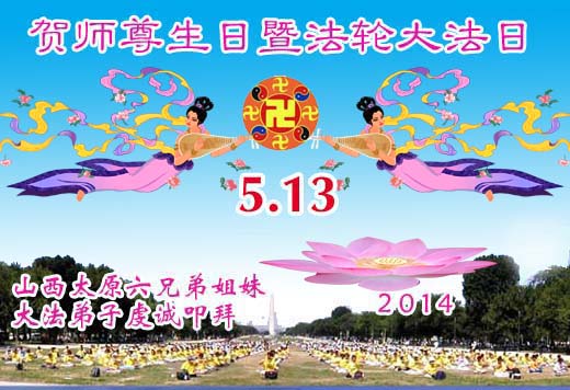 山西省大同大法弟子恭祝慈悲偉大的師尊生日快樂!慶祝法輪大法洪傳二十二週年!慶祝5.13法輪大法日!