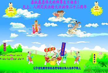 值此法輪大法洪傳二十二週年,紀念法輪大法十五週年,師尊六十三華誕之際,深溝寺一學法小組的三位大法弟子從心靈深處發出:祝師父您生日快樂!您辛苦了!在正法進程所剩不多的日子裏,請師尊放心:我們一定緊跟正法進程做好三件事,多救人,快救人,遇事向內找,修心去執著。圓滿隨師回家。