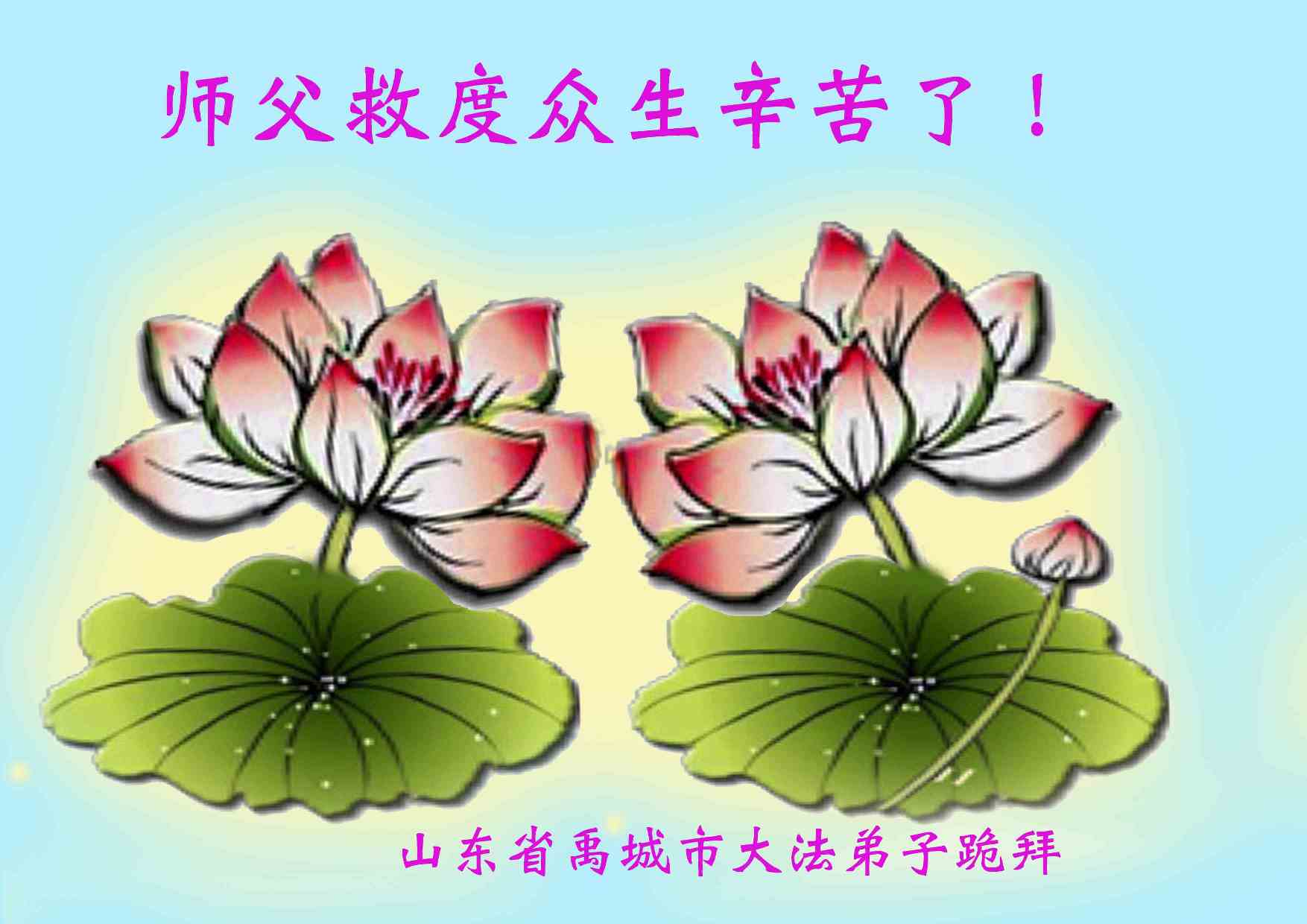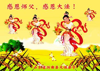 弟子感恩師尊慈悲救度!十幾年的修煉歷程,弟子每一步的提高都離不開師尊的慈悲呵護和巨大承受!弟子時刻牢記師尊的慈悲叮嚀,每一思每一念都要用真善忍宇宙大法的法理來約束自己,周圍的世人從弟子身上看到了大法的美好和祥和,弟子給他們講真相他們也容易接受。弟子一定更加努力,爭取救度更多的眾生,早日跟師父回家!
