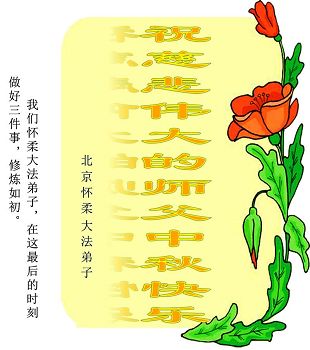 師父:我們想念您!盼望您早日回北京!我們是在師尊「遍地開花」的大法裏,在師尊轉的大法輪中盛開的一朵小花,每個大法弟子都發揮著大法給予自己的特長和能力,自動的精進的做著自己該做好的三件事。請師尊放心,我們一定按照大法的要求,實修好自己,做名副其實的正法時期大法弟子,準備迎接師父回北京!