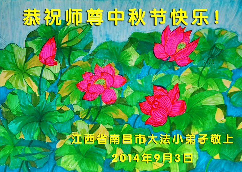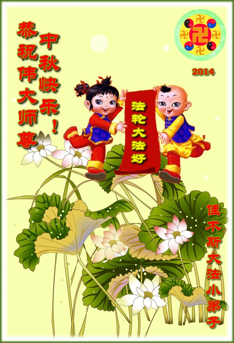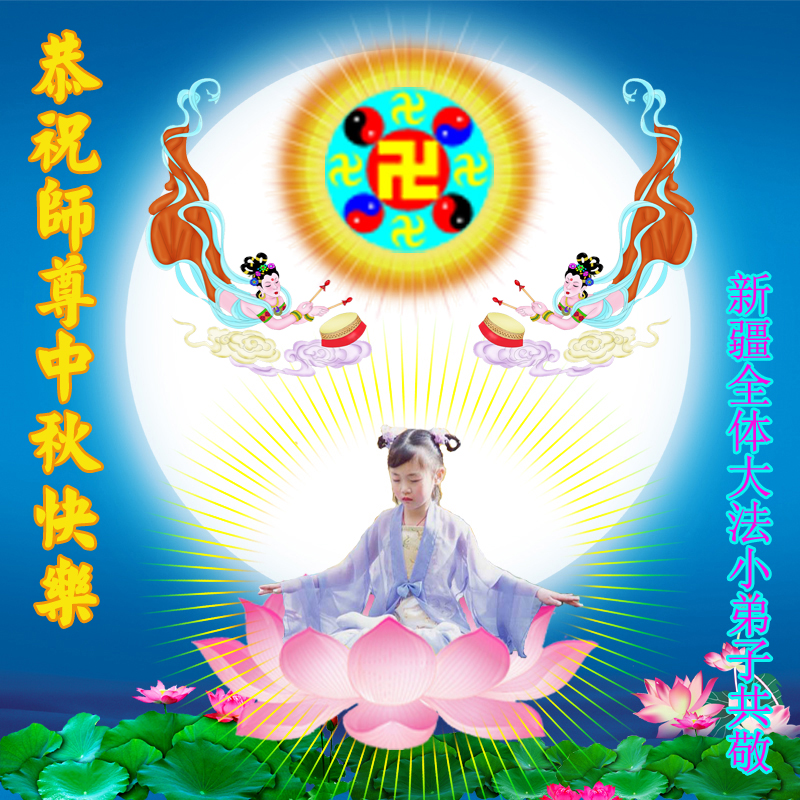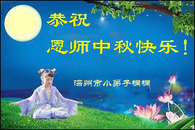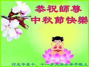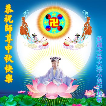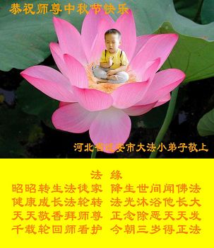 有一位大法小弟子向師尊問候師父好!我是大法小弟子,今年九歲了,我天天晚上跟著爺爺、奶奶學大法,今年考試在全三年級第一。我感恩師父!恭祝師父中秋節快樂!