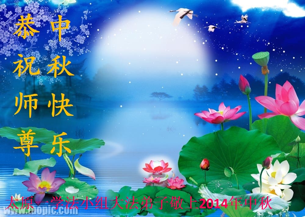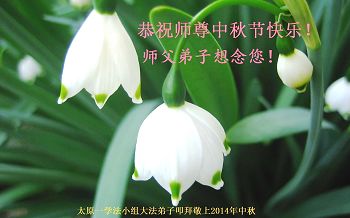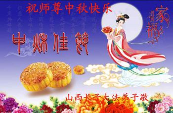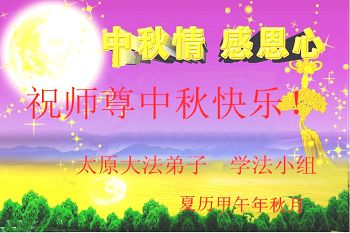 尊敬的師父好:我們用盡人類的語言也無法表達對您的思念與感恩,感謝師尊的慈悲苦度。今後我們決心踏實的做三件事,不忘自己的使命,多救人,讓師父多一份欣慰。每逢佳節倍思親,在中秋來臨之際,遙祝師尊中秋快樂。