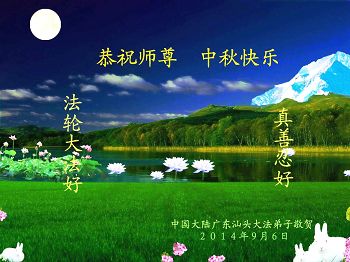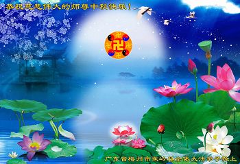 在一年一度的「中秋節」來臨之際,我雖然沒有辦法和師父直接見面,但是,我希望在遙遠的故鄉為師父獻上一份我最衷心的問候:「唯願師尊笑」!但願國內的每個大法弟子都能夠在這個「大團圓」的美好日子裏,用自己的方式向我們慈悲偉大的師父表達一份心意,讓師父多一點欣慰和快樂!同時,用我們的實際行動來完成助師正法,救度眾生,證實大法的歷史使命,不辜負師父對我們的期盼!