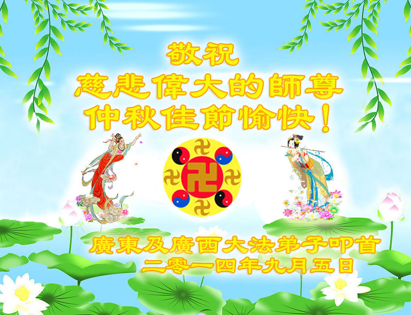 廣東省恩平市一學法小組的大法弟子感恩慈悲偉大的師父對弟子的救度!恭祝慈悲偉大的師父二零一四年中秋節快樂!