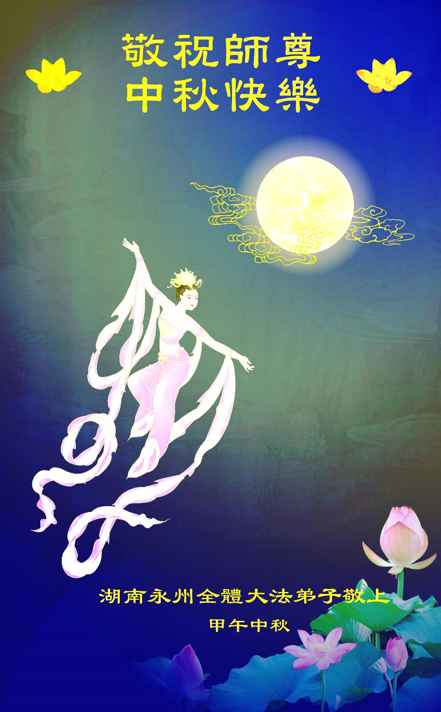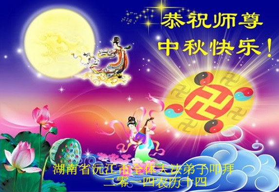 湖南省懷化地區安江大法弟子向偉大的師尊中秋佳節問好!並祝師尊中秋節快樂!我要加倍努力做好正法時期大法弟子該做好的一切,徹底否定邪惡舊勢力的一切安排與迫害!