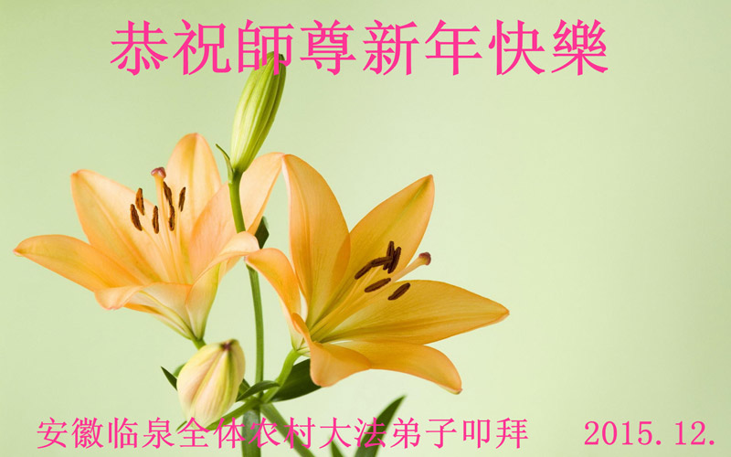 師父您好!在這喜迎一六年元旦的日子裏,弟子祝您新年愉快!過去的一年裏,您為弟子操碎了心,我們每精進一步都離不開您的慈悲呵護,您的每一次點化、鼓勵,弟子明白後都能按大法的法理去做,特別遇到矛盾時,弟子都能無條件的找自己,在修好自己中去救人,不辜負您的厚望。我們在此叩首向師尊表示衷心的感謝!