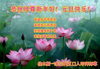 在新年來臨之際,我們一家三口大法弟子恭祝師父新年好!二十年來師父給予和呵護我們無法用語言言表,在此叩拜師父,我們只有聽師父的話,精進實修做好三件事,以報師恩和師父回家。