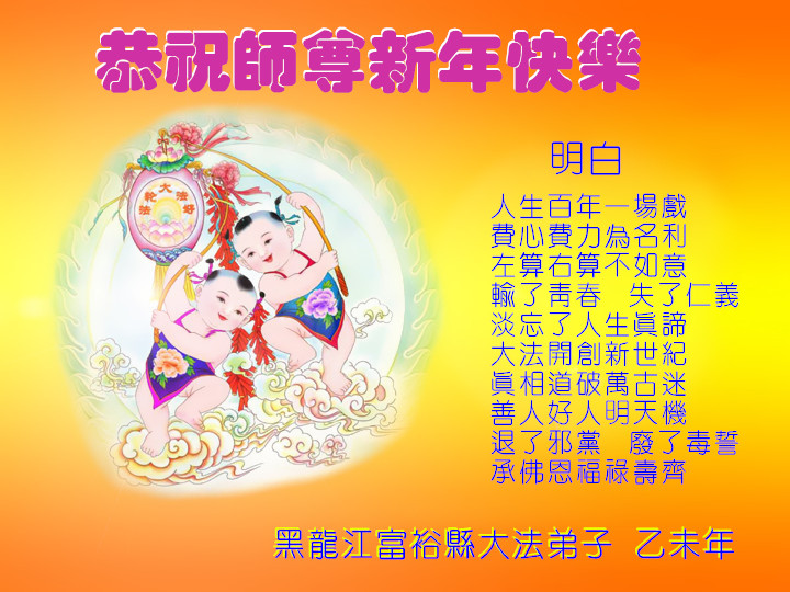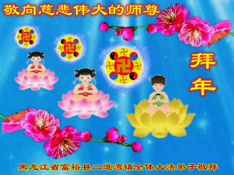 黑龍江省齊齊哈爾市富裕縣二道灣鎮全體大法弟子向慈悲偉大的師尊拜年!