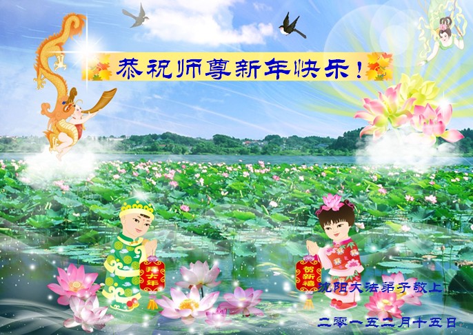 瀋陽一大法弟子全家祖孫三口及一學法小組恭祝慈悲偉大的師尊新年好!合十!叩拜!