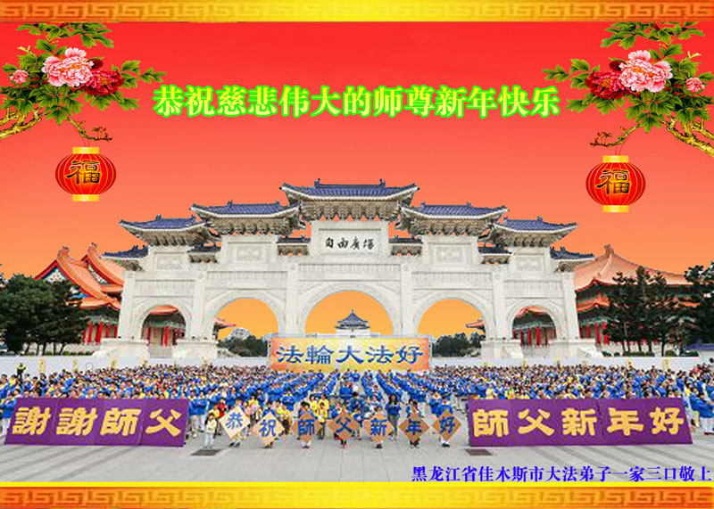 黑龍江省佳木斯市大法弟子一家三口向慈悲偉大的師尊拜年!恭祝師尊新年快樂!