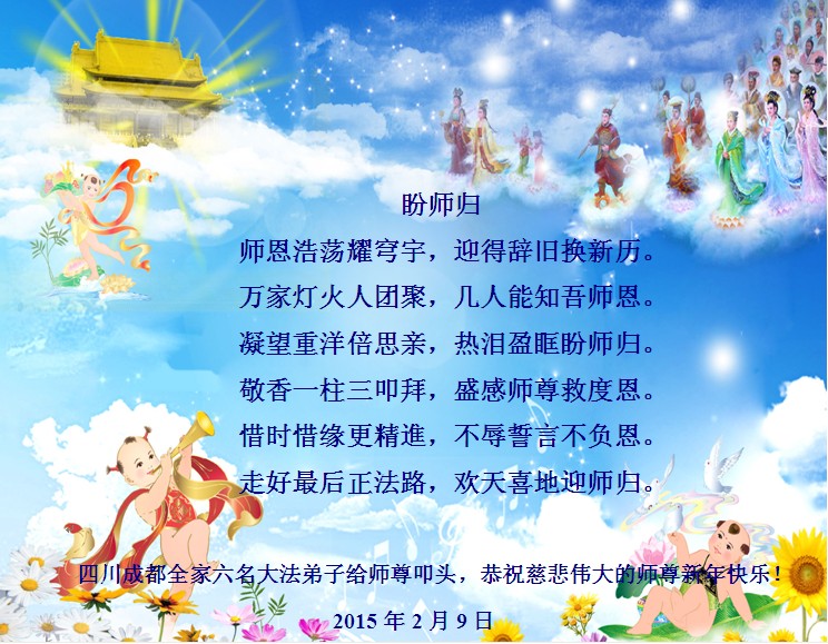 新年來臨,我們四川成都二代五人學法小組全體弟子感慨萬千,千言萬語道不盡師父洪大慈悲的救度之恩!在此弟子們給師父拜年,恭祝師父新年好!新年快樂!師父辛苦了!弟子們想念師父!
