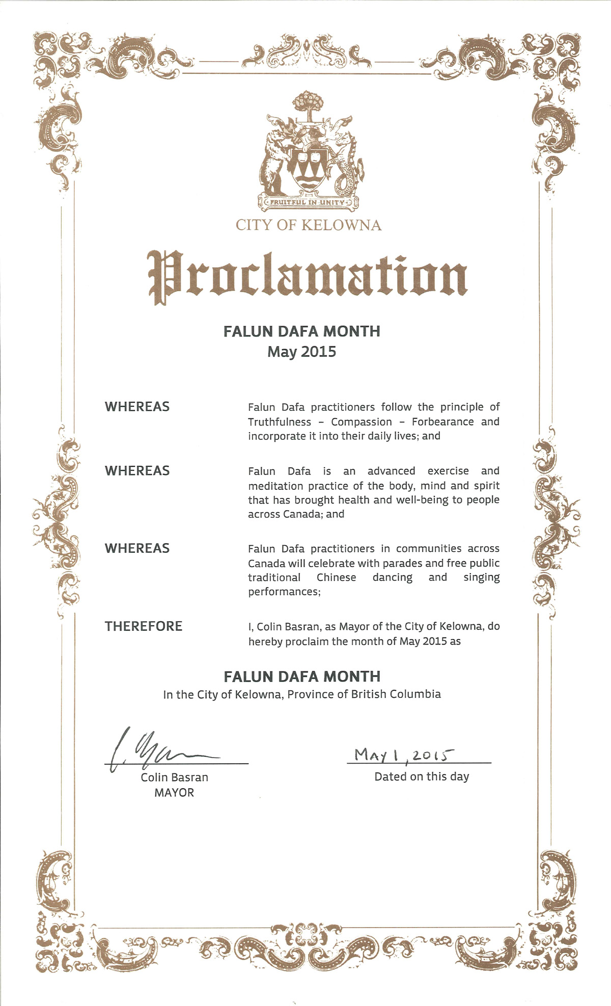 鑑此,我,基隆拿市市長科林•巴士拉(Colin Basran),特此宣布二零一五年五月為
