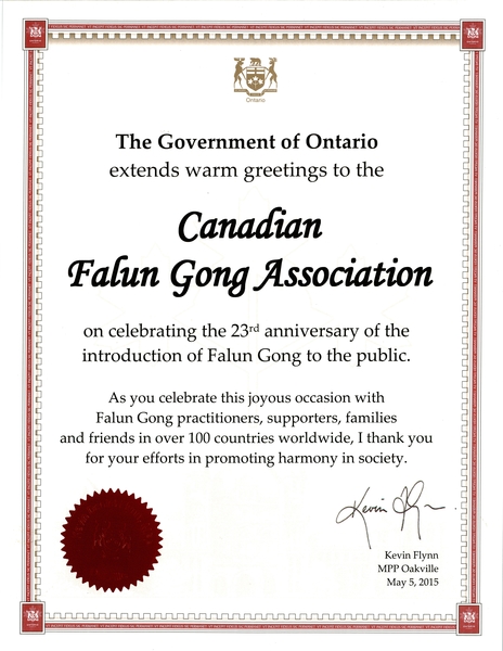 安省勞工廳長斐廉恩(Kevin Flynn)在賀信中表示,值此法輪大法洪傳二十三週年之際,他向加拿大法輪大法學會表示熱烈的祝賀。「在全世界的法輪功學員、支持者、親人和朋友慶祝這一歡樂時刻之際,我感謝你們對促進社會和平所做出的努力。」